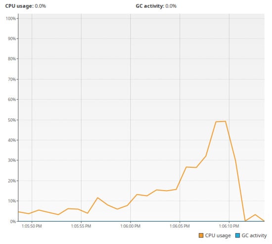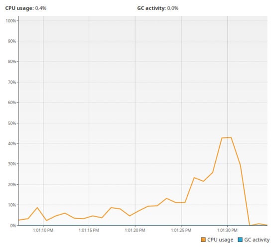Figure 8 and Figure 9 show CPU utilization profiles for the HtmlFlow-Virtual and HtmlFlow-Susp implementations, respectively. The subsequent gradual increase in CPU utilization reflects the ramp-up of concurrent users during the benchmark. HtmlFlow-Virtual exhibits a distinctive bell-shaped curve, rapidly climbing from near-zero to peak CPU usage of around 50% during the sustained load phase, maintaining moderate utilization during the test period, and then dropping sharply back to baseline. HtmlFlow-Susp displays a similar pattern but with a slightly lower peak CPU utilization of approximately 42%, showing marginally lower intensive CPU usage during the sustained load phase. Both profiles demonstrate comparable resource consumption patterns, with the virtual thread implementation showing only slightly higher CPU demands. The GC activity indicators in both profiles remain relatively low throughout the test duration, confirming that garbage collection overhead does not significantly impact CPU utilization in either approach.