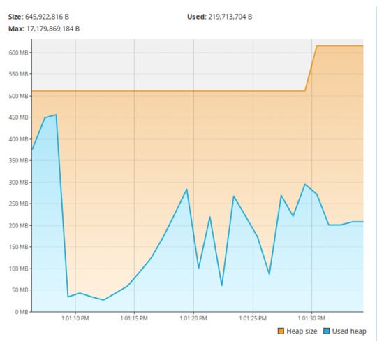 Figure 10 and Figure 11 show similar memory usage for both approaches, with peaks around 300 MB during load. The initial spike to 450 MB in both graphs corresponds to the applications’ bootstrapping phase. Overall, these results indicate that under the tested conditions, virtual threads and suspendable coroutines exhibit comparable memory consumption.