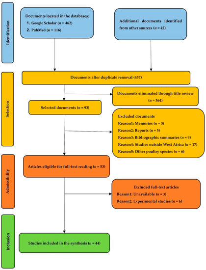 The literature search was structured according to the methodology of the Preferred Reporting Items for Systematic Reviews and Meta-Analyses (PRISMA) [13]. Searches were conducted first in the free Google Scholar and PubMed databases. They covered only documents written in English and French in the years from 2001 to 2021. After reading and sorting the documents, only scientific articles dealing with the phenotypic characterization of local chickens in rural areas in West African countries were selected. At the same time, personalized and specific searches were conducted to obtain reference documents on the subject and some scientific articles from non-indexed journals. Specifically, the syntaxes used were as follows: