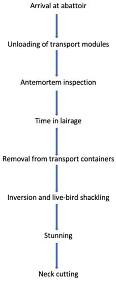 There are some key processes which birds must go through on arrival at abattoirs before they are bled out. These legislated processes are in place to protect the welfare of the birds and ensure that the resulting meat is fit for human consumption. Indeed, it is also worth noting that as well as the potential negative impact on bird welfare, rough pre-slaughter handling can affect the quality of the resulting carcass and meat [25]. For instance, rough handling of birds in the abattoir can impede their welfare by causing acute stress, which then leads to the production of meat of inferior quality known commonly as pale soft exudative (PSE) meat. PSE meats are characterised by an abnormal meat colour with high drip loss, conditions that affect the saleability of meat. Ali and colleagues [25] outlined the main welfare issues before stunning and slaughter as heat stress, feed and water withdrawal, crating and transport, and inversion and live bird shackling. Figure 1 below outlines the mandatory processes for birds (in the UK and within the EU) during primary processing in abattoirs that use water bath stunning [26]. Where animals are stunned using controlled atmosphere (gas) stunning, several steps in Figure 1 are not required, including the removal of birds from transport containers, and inversion and shackling. Non-stun abattoirs follow the same procedures as water bath stunning, except for the stunning stage, which is not performed.