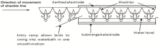 - In high-throughput abattoirs where it is impractical to switch off the current due to multiple birds passing through the water bath at any given time, a steep ramp (extended over the water) should be bolted to the entrance to the water bath to ensure that the head and wings of the bird enters the water first (see Figure 2) [35].