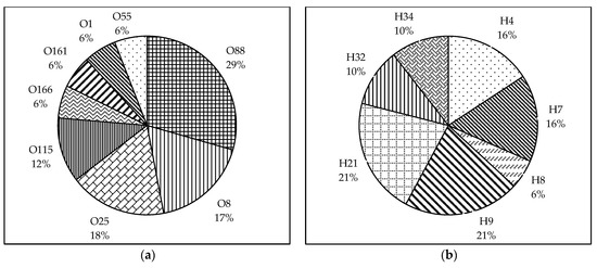 Pie charts showing the prevalence of O and H serogroups among the broiler breeder APEC isolates. (a) The O-serogroups identified among the typed isolates were O88, O8, O25, O115, O166, O161, and O1. (b) The H serogroups identified among the typed isolates were H4, H7, H8, H9, H21, H32, and H34. Data represented as the percentage of prevalence.
