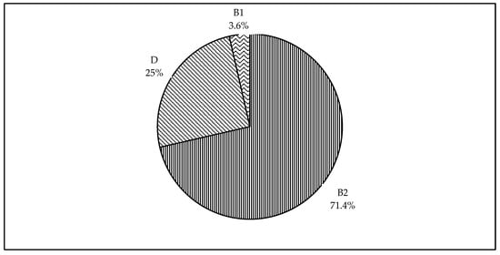 Figure 2 shows the distribution of phylogenetic groups identified among the isolates of this study. We were able to type all 28 isolates into different phylogroups. The majority of the isolates were of the phylogenetic group B2 (71.4%). Lower prevalence was observed for the phylogenetic groups D and B1 with 25% and 3.6%, respectively. Of interest, none of the isolates were classified under the phylogenetic group A.