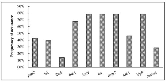 Prevalence of virulence-associated genes among broiler breeder APEC isolates. papC and tsh code for adhesins; ibeA for invasin; iutA and iroN indicate iron acquisition systems; iss and ompT for protectins; astA and hylF indicate toxins; and cva/cvi is part of the colicin V plasmid.