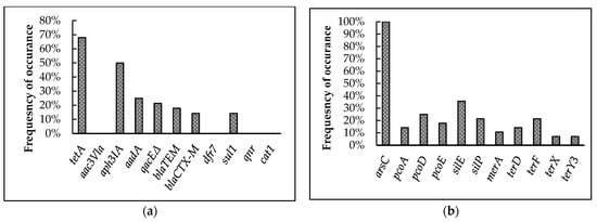 The presence of antimicrobial and heavy-metal resistance genes identified in the 28 isolates are represented in Figure 4a,b. Screening for AMR genes showed the highest prevalence for tetA (68%) followed by aph3IA (50%), aadA (25%), qacEΔ (21.4%), and blaTEM (17.9%). Further, blaCTX-M and sul1 exhibited an equal prevalence of 14.3% among the isolates. On the other hand, qnr, aac3Vla, cat1, and dfr7 were absent among the isolates analyzed.