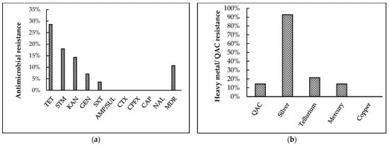 Following the broth-microdilution assay (Figure 5b), 14.3% of the isolates were found to be resistant towards QAC. Among the five metals tested, the isolates demonstrated highest resistance towards silver (92.8%), followed by tellurium (21.4%), and mercury (14.3%). Furthermore, 96.4% of the isolates were resistant to at least one of the five metals tested. In contrast, all isolates were susceptible to copper, and all isolates were susceptible to at least two metals tested.