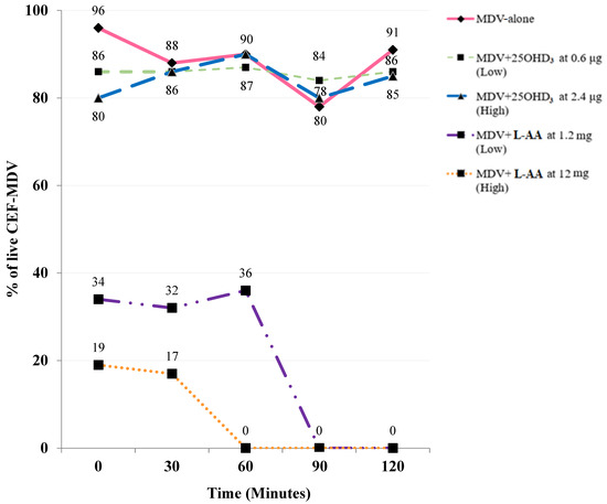 Fatemi SA, Williams CJ, Deines J, Peebles ED. Vitamin Compatibility with the Marek’s Disease Vaccine. Poultry. 2023; 2(4):442-448. https://doi.org/10.3390/poultry2040033