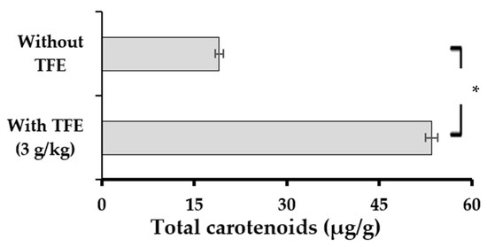 Concentrations of α-tocopherol in the yolk (Figure 1a) and liver of newly hatched chicks (Figure 1b) increased linearly with increasing VE levels in breeder diets. TFE did not affect α-tocopherol concentration in the yolk or liver, as assessed using contrast analysis between diets supplemented with 25 mg/kg VE (control) and 25 mg/kg VE + 3 g/kg TFE. Supplementation with TFE increased the total carotenoid content in freeze-dried yolk from 19.03 ± 0.67 µg/g to 53.48 ± 0.98 µg/g (Figure 2).