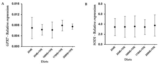 The relative expression of SOD1 and GPX7 in the livers of 1-day-old chicks were determined via qPCR (Figure 4A,B). Analyses showed that there were no effects of maternal diet (VE level or TFE supplementation) on relative gene expression.