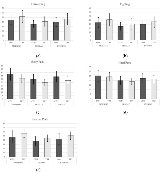Frequencies of agonistic behaviors at 50 weeks of age (n = 648/timepoint/treatment). Data presented as average frequency of the behavior observed in the 2 h period. (a) Frequency of threatening at 3 timepoints; (b) frequency of fighting at 3 timepoints; (c) frequency of body pecks at 3 timepoints; (d) average occurrences of head pecks at 3 points during the light period; and (e) average occurrences of feather pecks at 3 points during the light.
