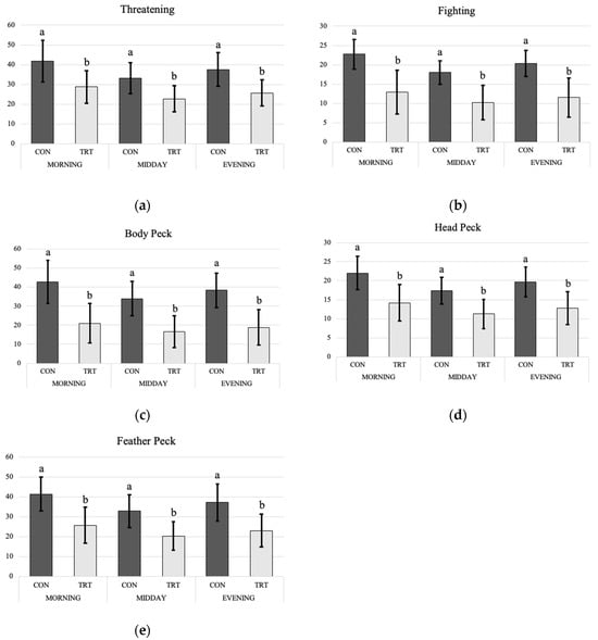 Frequencies of agonistic behaviors at 60 weeks of age (n = 648/timepoint/treatment). Data presented as average frequency of the behavior observed in the 2 h period. (a) Average occurrences of threatening at 3 timepoints; (b) average occurrences of fighting at 3 timepoints; (c) frequency of body pecks at 3 timepoints; (d) frequency of head pecks at 3 points during the light period; and (e) frequency of feather pecks at 3 points during the light. a,b Means with different superscripts differ at p < 0.05.