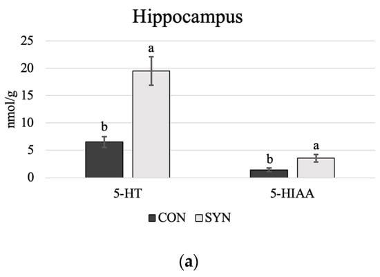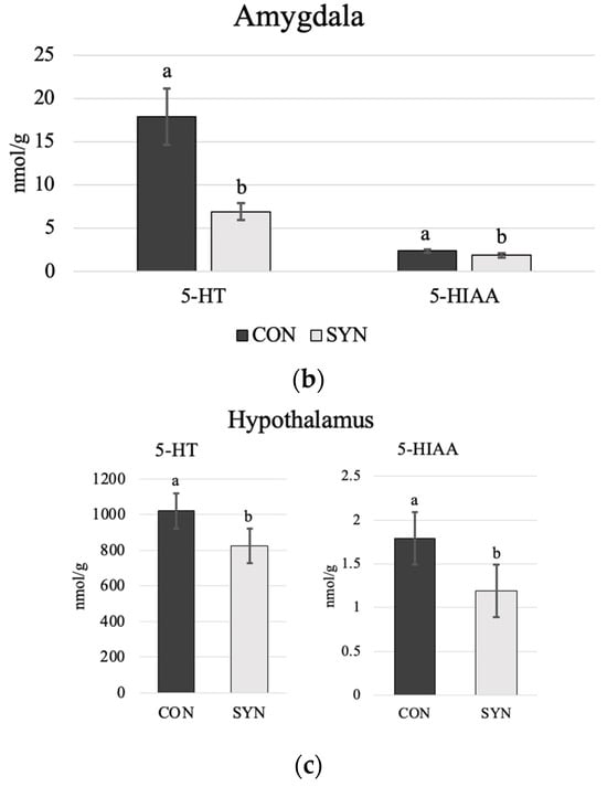 The results for serotonin and 5-HIAA levels are presented in Figure 3a–c. The concentrations of serotonin in the hippocampus were significantly higher in the SYN group compared to the CON group (p = 0.013, Figure 3a). The concentrations of serotonin were significantly lower in the SYN group compared to the CON group in the amygdala (p = 0.039, Figure 3b) and the hypothalamus (p = 0.026, Figure 3c). The levels of 5-HIAA were significantly higher in the SYN group compared to the control group in the hippocampus (p = 0.021). Concentrations of 5-HIAA were significantly lower in the SYN group compared to the CON group in the amygdala (p = 0.032) and hypothalamus (p = 0.001).