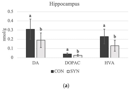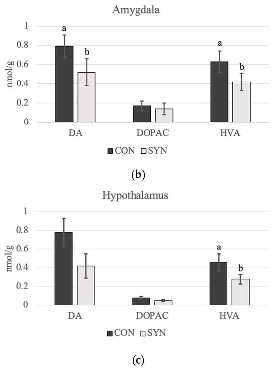The levels of dopamine, DOPAC, and HVA are presented in Figure 4a–c. Concentrations of dopamine were significantly lower in the SYN group in comparison to the CON group in the hippocampus (p = 0.032, Figure 4a) and amygdala (p = 0.021, Figure 4b). No differences were found in the DA levels in the hypothalamus across treatments (p = 0.052, Figure 4c). The concentration of DOPAC was significantly lower in the SYN group versus the CON group in the hippocampus (p = 0.032). No differences were observed in the DOPAC levels in the amygdala (p = 0.053) or the hypothalamus (p = 0.052) across treatments. The concentrations of HVA were significantly lower in the SYN group compared to the CON group in the hippocampus (p = 0.022), amygdala (p = 0.042), and hypothalamus (p = 0.041).