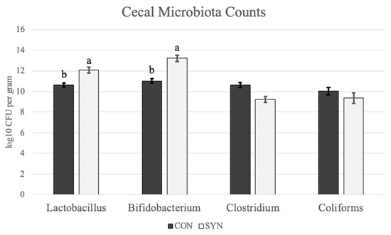 The results of the cecal microbiota count are presented in Figure 5. The counts of Lactobacillus species were significantly higher in the SYN group compared to the CON group (p = 0.036). The counts of the Bifidobacterium were significantly higher in the synbiotic group compared to the control group (p = 0.039). No statistical differences were observed for the Clostridium species (p = 0.262) or Coliforms species (p = 0.109) counts.
