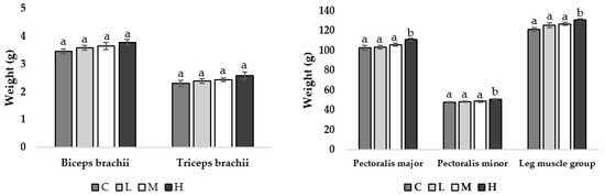 Muscle mean weight (g) ± SEM of pullets fed a control diet (C), or a basal diet supplemented with low (L; 50 mg/kg), medium (M; 100 mg/kg), or high (H; 150 mg/kg) boron at week 11 of age (n = 48 birds). a–b Means with different superscripts differ at p < 0.05.