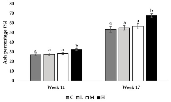 Tibia ash percentage of pullets fed a control diet (C), or a basal diet supplemented with low (L; 50 mg/kg), medium (M; 100 mg/kg), or high (H; 150 mg/kg) boron at weeks 11 and 17 of age (n = 48 birds/week). a–b Means with different superscripts differ at p < 0.05.