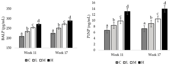 At weeks 11 and 17 of age, pullets fed the H diet had the greatest concentrations of BALP, compared to pullets fed the M diet (week 11 = 0.026, week17 = 0.033), followed by pullets fed the L diet (week 11 = 0.013, week 17 = 0.027), and pullets fed the C diet had the lowest BALP concentration (week 11 = 0.008, week 17 = 0.020; Figure 4). Also, at both the mentioned weeks of age, pullets fed the H diet had the greatest P1NP concentrations compared to pullets fed the M diet (week 11 = 0.036, week 17 = 0.021), with pullets fed the L (week 11 = 0.023, week 17 = 0.019) and C diets having the lowest P1NP concentrations (week 11 = 0.009, week 17 = 0.001; Figure 4).
