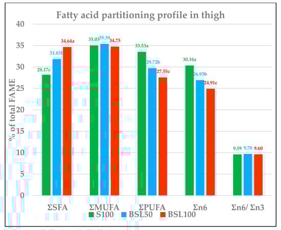 EPA showed a dissimilar behavior in the breast because BSL100 was not significantly different to S100, but it was different to BSL50. DPA and DHA were adversely affected by inclusions at any level (p < 0.001).