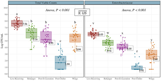 The box plots represent the total viable counts and Enterobacteriaceae counts (Log CFU/mL) on the five locations sampled at the four processing facilities evaluated in this study. For boxplots, the horizontal line represents the median, the upper and lower lines of the box represent the upper and lower quartiles (0.25 and 0.75, respectively), and the vertical upper and bottom lines represent 1.5 times the interquartile range and lower interquartile range, respectively. Dots represent each individual datum collected per indicator. Letters in the boxes (a–c) from the total viable counts and (v–z) from the Enterobacteriaceae counts mean that there is a statistically significant difference according to ANOVA analysis followed by a pairwise comparison t-test adjusted for Tukey at a p-value < 0.05. The numbers in the white boxes represent the mean of the same stage in a facility in the United States [38], used for comparative purposes.