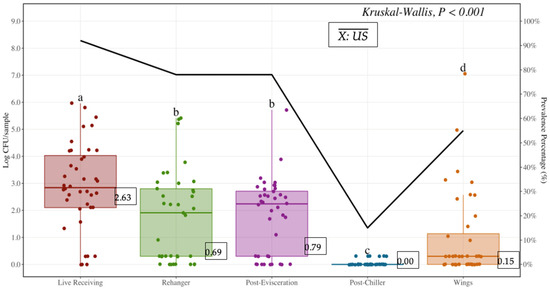 Salmonella counts (Log CFU/sample) and prevalence (%) on the five locations sampled of the process. For boxplots, the horizontal line represents the median, the upper and lower lines of the box represent the upper and lower quartiles (0.25 and 0.75, respectively), and the vertical upper and bottom lines represent 1.5 times the interquartile range and lower interquartile range, respectively. Dots represent each individual datum collected per pathogen. Letters in the boxes (a–d) mean that there is a statistically significant difference according to Kruskal–Wallis analysis followed by a pairwise comparison of Wilcoxon’s test adjusted for Benjamini and Hochberg at a p-value < 0.05. The numbers in the white boxes represent the mean of the same stage in a facility in the United States [38], used for comparative purposes.