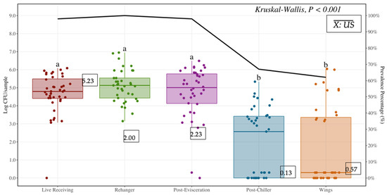 Campylobacter spp. counts (Log CFU/sample) and prevalence (%) on the five locations sampled of the process. For boxplots, the horizontal line represents the median, the upper and lower lines of the box represent the upper and lower quartiles (0.25 and 0.75, respectively), and the vertical upper and bottom lines represent 1.5 times the interquartile range and lower interquartile range, respectively. Dots represent each individual datum collected per pathogen. Letters in the boxes (a,b) mean that there is a statistically significant difference according to Kruskal–Wallis analysis followed by a pairwise comparison of Wilcoxon’s test adjusted for Benjamini and Hochberg at a p-value < 0.05. The numbers in the white boxes represent the mean of the same stage in a facility in the United States (5), used for comparative purposes.