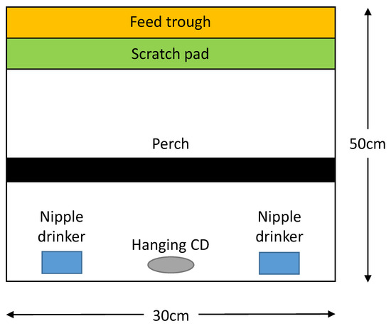 There were 6 treatments with 14 replicate cages and 2 birds per cage per treatment in this study. Hens had physical access to the following treatments: (1) no enrichment provided (control); (2) round, wooden perches provided (perch); (3) scratch pads provided (scratch pad); (4) hanging CDs provided (hanging CD); (5) all three aforementioned enrichment forms provided (complex environment); and (6) each aforementioned enrichment form was provided on a 2-week rotation (novelty). Specifically, the control group was not provided with any enrichment. Based on previous findings [5,6,7], the perch group was provided with round, semi-circle-shaped perches that were 32 mm in diameter, made of wood, and placed approximately 2.5 cm above the floor of the cage. The design of the scratch pad treatment was partly based on our previous observations during two different experiments in the same cage housing system, although there was no empirical data to support this observation. It was observed that birds tended to ‘sham’ forage near the feed tray, and it was, therefore, assumed that a scratch pad near the feed tray where they liked to sham forage may better satisfy this behavioral motivation. Scratch pads (artificial turf) have been shown to reduce bumble foot [8], and abrasive strips (10 cm wide and 50 cm long; angled 60° from the bottom of the cage) of material and have been shown to reduce toenail sharpness (subsequently, reducing the risk of injury), reduce fearfulness, and improve the feather scores of laying hens [9]. Based on this evidence, we built an angled scratch pad along the length of the feed trough at the front of the cage, providing a total length of 30 cm and a height of 10 cm; the scratch pad was made of wood and covered with super fine grit sandpaper (600–800 grit).