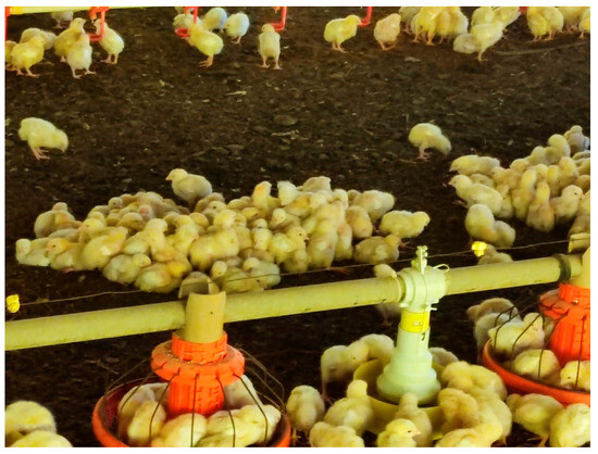 On the fourth day of life, the chicks began to consume less feed, presented with watery diarrhea or poorly digested feed, and were observed to be clustered together, showing environmental discomfort (cold) (Figure 1). On the sixth and seventh days of life, the chicks exhibited a decline in performance, delayed growth, and a lack of uniformity (approximately 50%), accompanied by a slight increase in mortality. Of the 22 chicks that exhibited clinical signs, 6 had no gizzard erosions (Group A), while 16 had gross lesions in the gizzard (Group B).