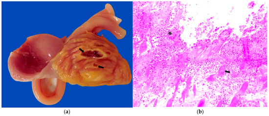 Gross and microscopic images of the gizzard of seven-day-old chicks. (a) Deep and locally extensive necrosis (arrow) in the koilin membrane with brown center (ulcer) and some millimetric erosions (arrow). (b) Necrosis and disruption of the koilin membrane (arrow) with cellular debris and inflammatory cells (*). Hematoxylin and eosin (HE) 100×.