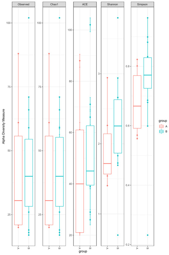 Seven-day-old-chicks. Group A (without gizzard erosion and ulceration) and group B (with gizzard erosion and ulceration). The graph of observed species richness and alpha diversity measures: Chao1, ACE (species richness estimator), Shannon, and Simpson tests (species diversity indices). Only in the Shannon and Simpson test was there a difference, with more diversity in the group with gizzard erosion (B). No significant differences were observed between the groups using the Mann–Whitney tests (p > 0.05).