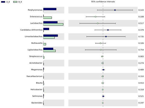 Statistical chart representing the main genera (top 15 genera) found in groups A, without gizzard erosion and ulceration (blue color), and B, with gizzard erosion and ulceration (green color). Porphyromonas, Candidatus Arthromitus, and Limosilactobacillus were statistically more abundant in group A (p < 0.005).