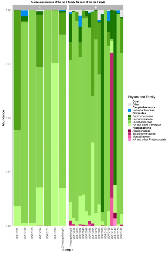 Stacked bar chart of the abundance of the main phyla and families present in the ileum of chicks, group A (without gizzard erosion and ulceration), and group B (with gizzard erosion and ulceration). Each column represents a seven-day-old chick.