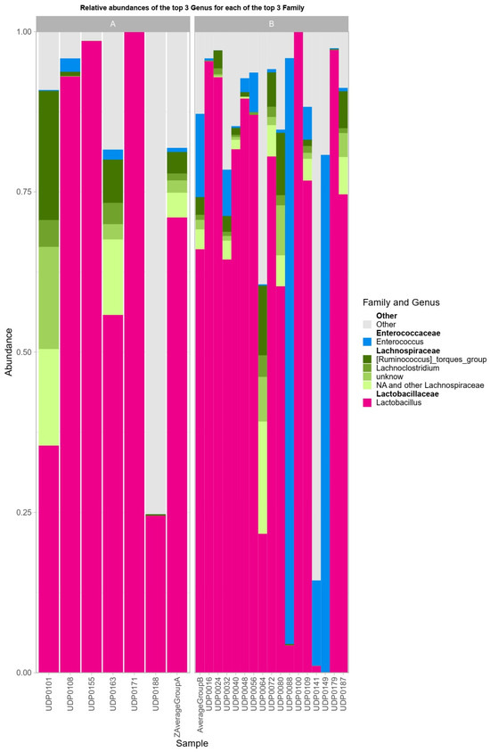 Stacked bar chart of the abundance of the main families and genera present in the ileum of chicks, group A (without gizzard erosion and ulceration), and group B (with gizzard erosion and ulceration). Each column represents a seven-day-old chick. Lactobacillus is predominant in both groups, but the Enterococcus genus is more abundant in the group with gizzard lesions.
