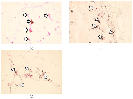 (a–c). Histologic findings of melanosis in dermal and celomic fat tissue from downgraded 31-to-50-day-old, male Cobb500TM broiler chicken carcasses of cases 3 and 4 in Argentina. (a). Scattered melanocytes randomly distributed in between the adipocytes of celomic fat tissue (white arrows). H&E (objective 40×). (b,c). Back melanin granules, diffusely distributed within subcutaneous tissue, and multifocally to coalescent surrounding adipocytes (white arrows). Fontana–Masson (objectives 20× and 40×).