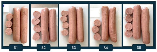 Photographs of sausages elaborated with different proportions of chicken (CBM) and quail (QBM) breast meats and mechanically deboned chicken (MDCM) and quail (MDQM) meats. S1 = elaborated with 100% CBM only (reference); S2 = elaborated with 100% QBM only; S3 = 60% CBM and 40% MDQM; S4 = 60% QBM and 40% MDCM; and S5 = 50% MDQM and 50% MDCM.