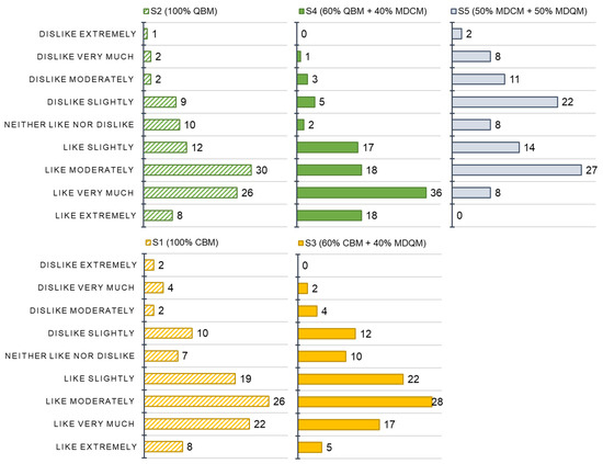Absolute frequency of acceptance scores for poultry sausages elaborated with different proportions of chicken (CBM) and quail (QBM) breast meats and mechanically deboned chicken (MDCM) and quail (MDQM) meats. S1 = elaborated with 100% CBM only (reference); S2 = elaborated with 100% QBM only; S3 = 60% CBM and 40% MDQM; S4 = 60% QBM and 40% MDCM; and S5 = 50% MDQM and 50% MDCM.