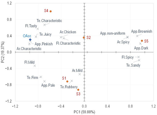 External preference map of attribute descriptive terms (App. = appearance; Fl. = flavor; Ar. = aroma; and Te. = texture), treatments, and overall acceptance (OAcc) of poultry sausages elaborated with different proportions of chicken (CBM) and quail (QBM) breast meats and mechanically deboned chicken (MDCM) and quail (MDQM) meats. S1 = elaborated with 100% CBM only (reference); S2 = elaborated with 100% QBM only; S3 = 60% CBM and 40% MDQM; S4 = 60% QBM and 40% MDCM; and S5 = 50% MDQM and 50% MDCM.