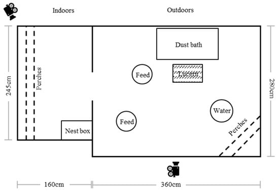 The chickens were kept in an outdoor aviary (360 × 280 cm) containing two feed bells, one water bell, one bale of lucerne, a dust bath, and perches (Figure 1). Furthermore, they had access to an indoor area (245 × 160 cm), which they used for egg laying and perching during the night (Figure 1). The chickens rarely used the indoor area during the day.
