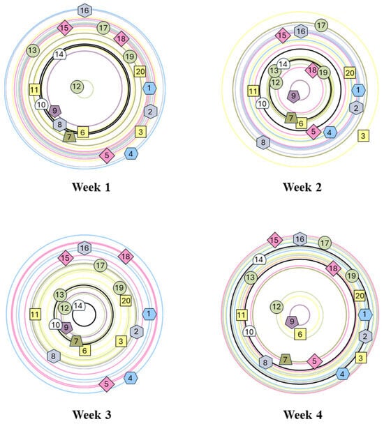 Degree of centrality of individuals 1–20 over four weeks of observation. The higher the degree of centrality, the closer to the centre of the circle. The same colour and shape indicate full siblings.