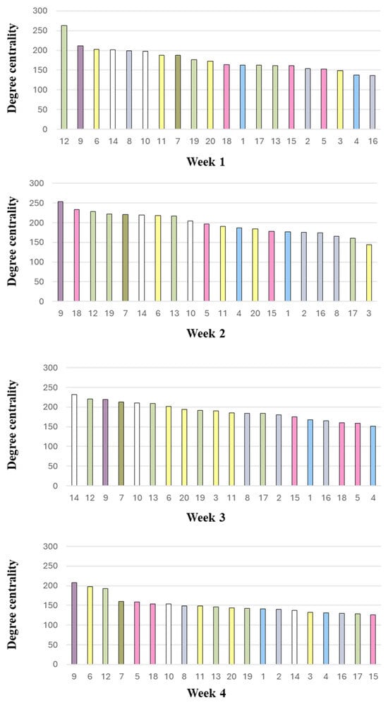 Degree of centrality of individuals 1–20 over four weeks of observation. The same colour indicates full siblings.