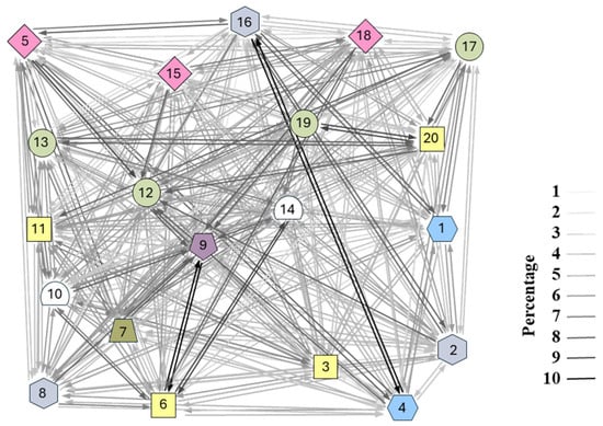 Social affiliations of individuals 1–20 over four weeks of observation. Percentage of an individual’s total number of interactions with a particular individual, where 5.26% is the level for complete random associations. The same colour and shape indicate full siblings.