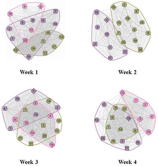 Louvain clusters revealing the subgroups of individuals 1–20 over four weeks of observation. The same shape indicates full siblings. Encircled individuals of a similar colour represent clusters of individuals with the highest affiliation tendencies.