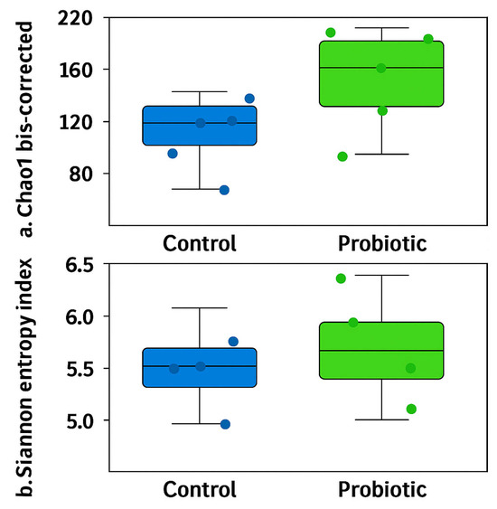 Alpha diversity of the oviduct microbiota in laying hens fed a control diet or supplemented with a multi-species probiotic. Alpha diversity was assessed using the bias-corrected Chao1 (a) and Shannon entropy indices (b). There are no significant differences between groups when estimated by unpaired t-tests.