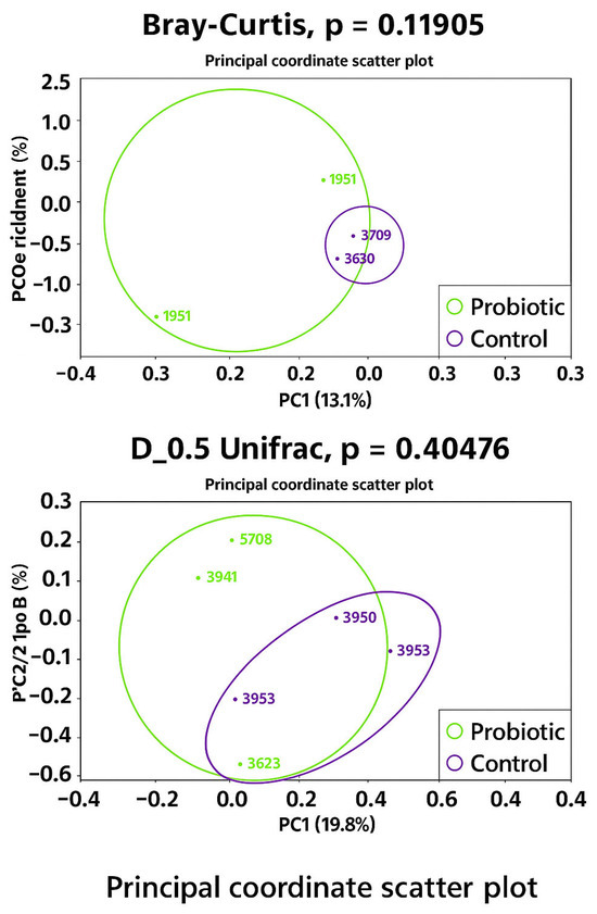 PERMDISP analysis revealed a trend towards greater dispersion in the probiotic group compared to the control group (p = 0.055), suggesting increased variability in microbiota composition among probiotic-treated layers. This trend was particularly apparent when dispersion was estimated using Euclidean distances (p = 0.05556), with the probiotic group showing greater intra-group dissimilarity than the control. As beta dispersion evaluates the variability of samples within groups while PERMANOVA tests for differences in group centroids, both analyses were considered to ensure an accurate interpretation of beta diversity patterns.