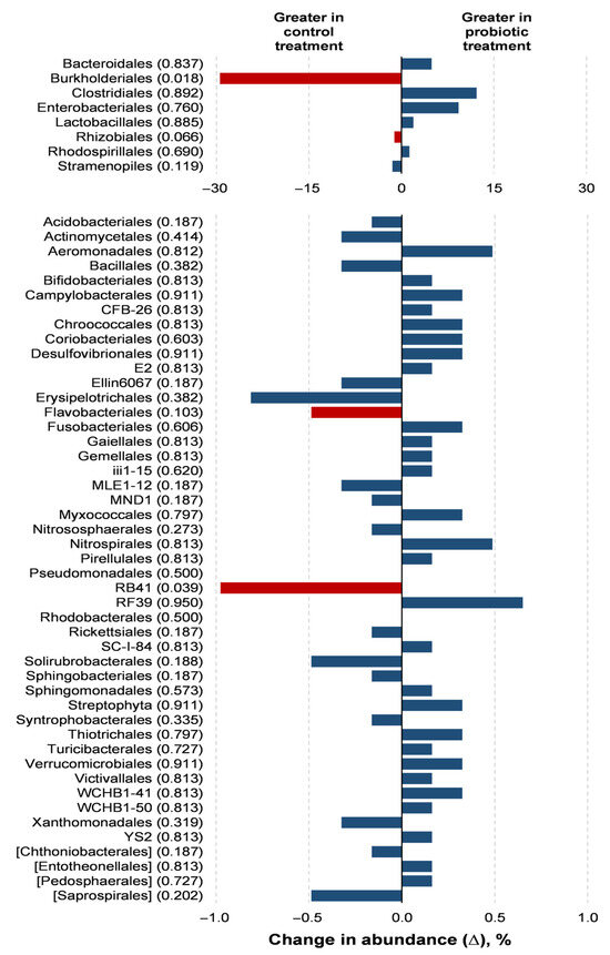 Comparison of the relative abundance of microbiota orders in the oviduct tracts of laying hens fed a control diet or supplemented with a multi-species probiotic 1. 1 Bars indicate the absolute difference between treatments, with p-values following the name of each order. Red bars showed differences at p ≤ 0.10. Given the exploratory nature of this study and the limited knowledge on oviduct microbiota in poultry, we opted to present a broader set of taxonomic data, including non-significant differences, to provide a more comprehensive view of potential microbial shifts associated with probiotic supplementation. This approach aims to support future hypothesis-driven investigations in this emerging research area.
