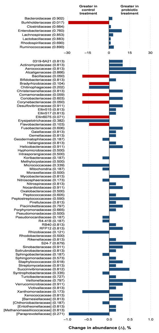 Comparison of the relative abundance of microbiota families in the oviduct tracts of laying hens fed a control diet or supplemented with a multi-species probiotic 1. 1 Bars indicate the absolute difference between treatments, with p-values following the name of each family. Red bars showed differences at p ≤ 0.10. Given the exploratory nature of this study and the limited knowledge on oviduct microbiota in poultry, we opted to present a broader set of taxonomic data, including non-significant differences, to provide a more comprehensive view of potential microbial shifts associated with probiotic supplementation. This approach aims to support future hypothesis-driven investigations in this emerging research area.