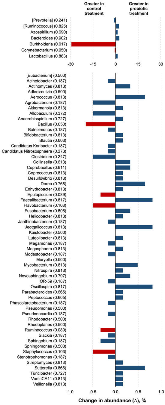 Comparison of the relative abundance of microbiota genera in the oviduct tracts of laying hens fed a control diet or supplemented with a multi-species probiotic 1. 1 Bars indicate the absolute difference between treatments, with p-values following the name of each genus. Red bars showed differences at p ≤ 0.10. Given the exploratory nature of this study and the limited knowledge on oviduct microbiota in poultry, we opted to present a broader set of taxonomic data, including non-significant differences, to provide a more comprehensive view of potential microbial shifts associated with probiotic supplementation. This approach aims to support future hypothesis-driven investigations in this emerging research area.