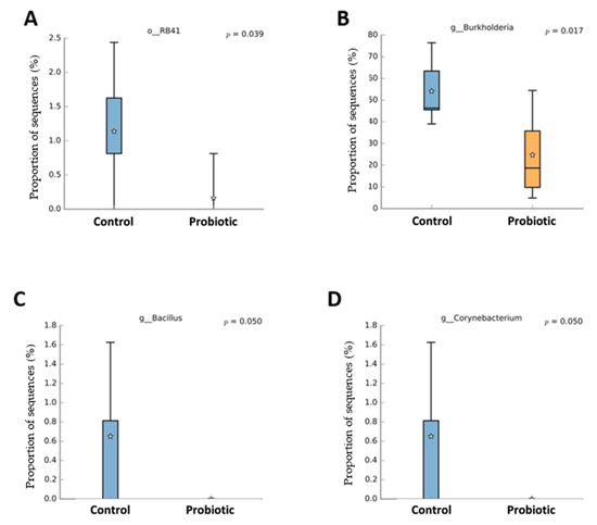 Taxa with significant difference (p < 0.05) between laying hens fed a control diet or supplemented with a multi-species probiotic 1. 1 Box diagrams represent the median of the samples as a line, the mean as a star, and the 25th and 75th percentiles as the upper and lower lines of the box. The bars indicate the most extreme data points within 1.5 * (75th–25th percentile) of the median. Data points outside the bars are shown as ‘*’. (A) Relative abundance of the bacterial order RB41 was significantly reduced in the probiotic group compared to the control (p = 0.039). (B) The genus Burkholderia showed a significantly lower abundance in the probiotic group (p = 0.017). (C) The genus Bacillus was only detected in the control group, with a borderline significant difference (p = 0.050). (D) Similar to Bacillus, the genus Corynebacterium was present in the control group but nearly absent in the probiotic group (p = 0.050).