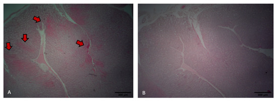 Oviduct tract morphology of laying hens fed a control diet (A) or supplemented with a multi-species probiotic (B). (A) Histological section of the oviduct from a control bird showing areas of epithelial damage and inflammatory infiltration (indicated by red arrows). (B) Oviduct tissue from a probiotic-fed bird exhibiting intact epithelial structure and absence of visible inflammation.