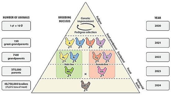 Conventional broiler chicken breeding strategy (time period on the right, approximate number of chickens produced in each generation on the left) [114].