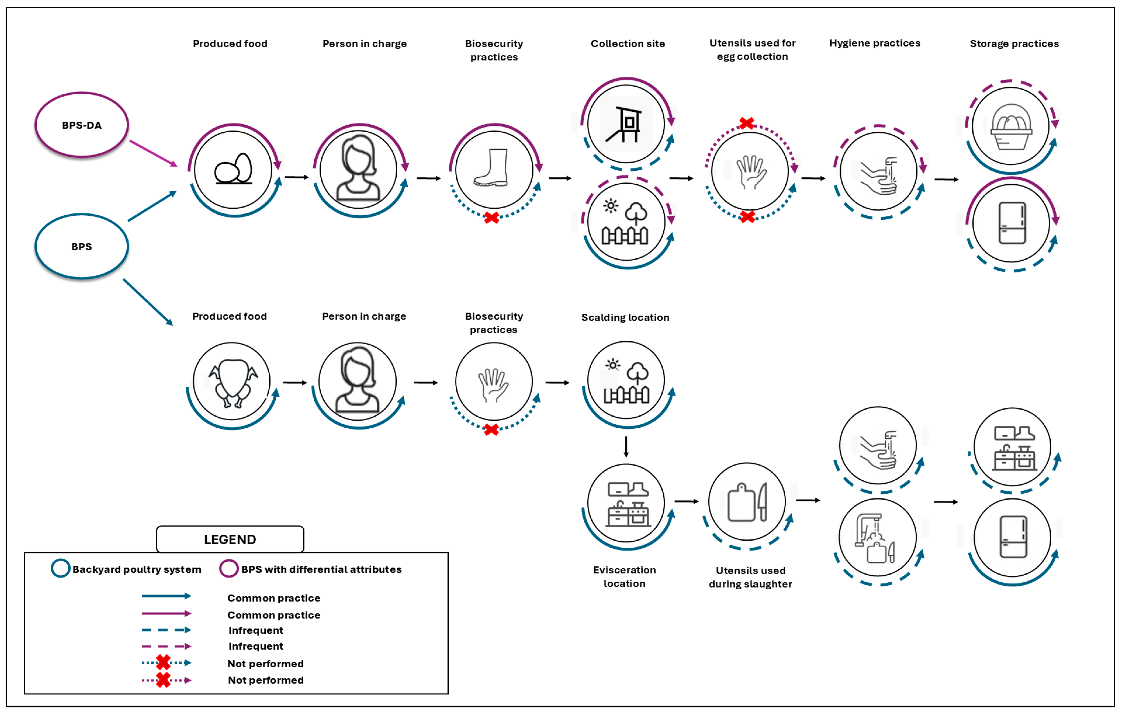 - Traditional Backyard Systems (BPS) are primarily oriented toward household food access, with frequent on-site slaughter, mixed or confined management, informal commercialization as an essential economic complement, lower household income, and limited or absent biosecurity measures.